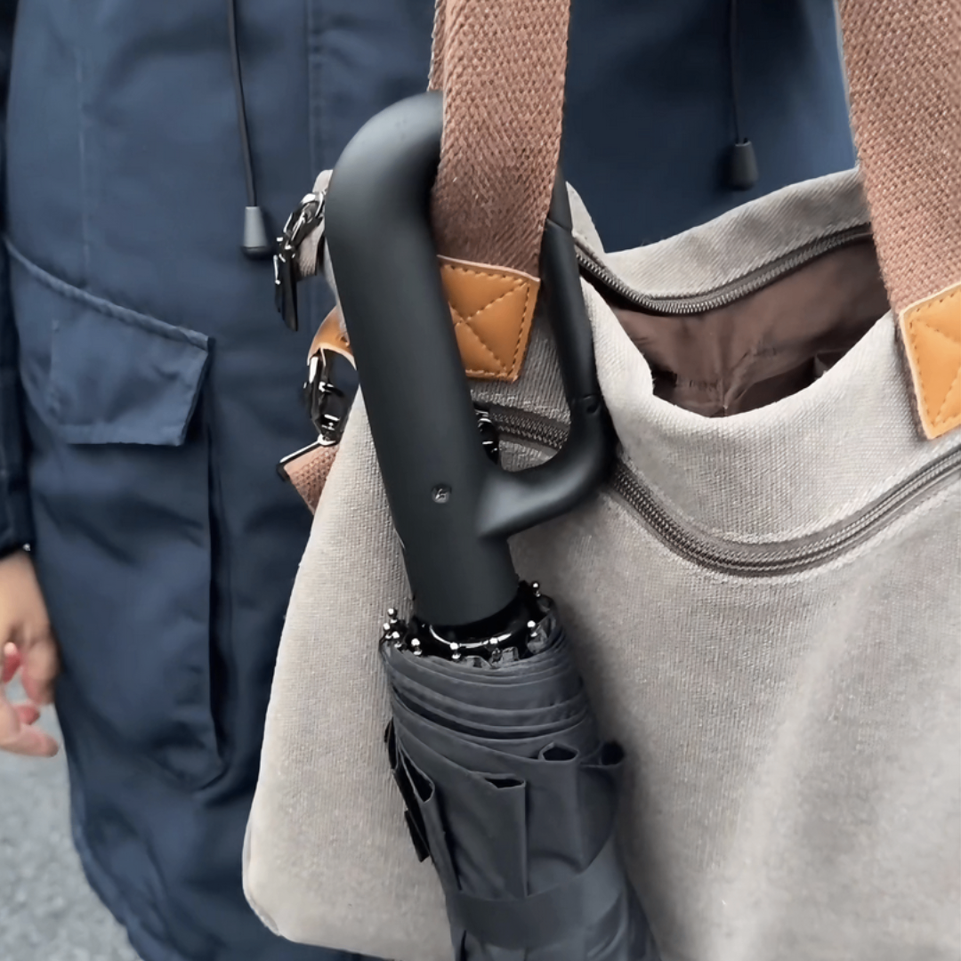 Thanks to the rotating handle that turns into a hook, you can clip the umbrella to your backpack or bag in seconds. Zero bulk, always ready when you need it.